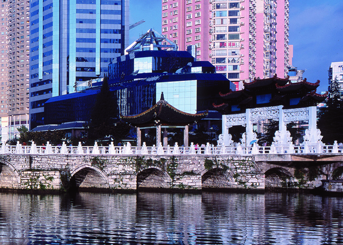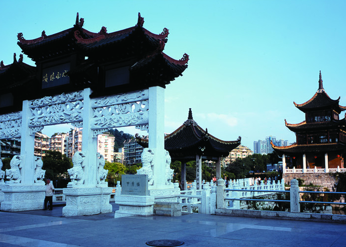 東景五星級酒店及辦公樓項目位于貴陽市觀山湖區(qū),基地東鄰貴陽市行政中心,北鄰鋁鎂設(shè)計院,南鄰貴州移動指揮調(diào)度中心,西向陽森房產(chǎn),地塊基本呈矩形,項目總用地面積24966平方米,總建筑面積99284平方米,其中地下建筑面積41915平方米。地上建筑面積共57369平方米,地下部分共計4層,為停車庫及酒店配套用房。地上部分由一棟結(jié)構(gòu)總高64.4m的14層辦公樓和一棟結(jié)構(gòu)總高68.8m的16層酒店組成,兩棟塔樓平面呈L型布置,結(jié)構(gòu)形式均為現(xiàn)澆框架剪力墻結(jié)構(gòu),辦公樓頂部采用鋼結(jié)構(gòu)向外懸挑兩層,懸挑跨度為11.1m。辦公樓和酒店在頂部通過跨度為30m鋼結(jié)構(gòu)連接體相連,連接體在辦公樓側(cè)與混凝土柱鉸接相連,在酒店一側(cè)用滑移支座相連,滑移支座接罕遇地震下兩座單體最不利彈性位移進行設(shè)計,保證兩個單體在罕遇地震下不致相撞或脫開。