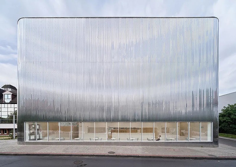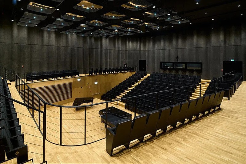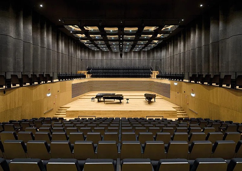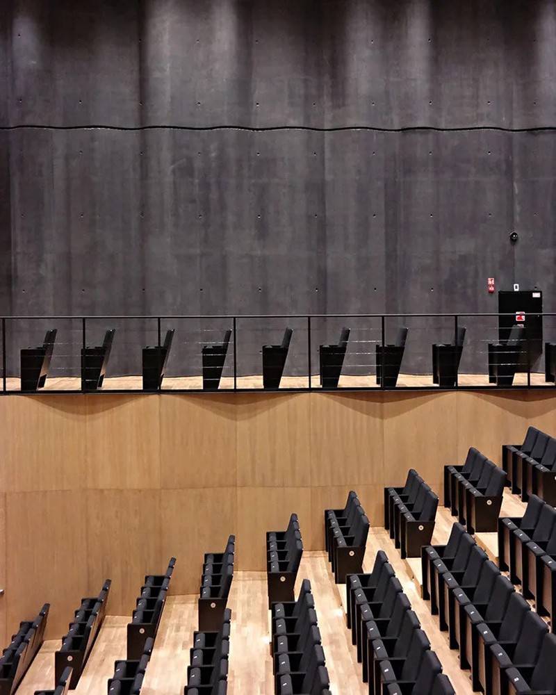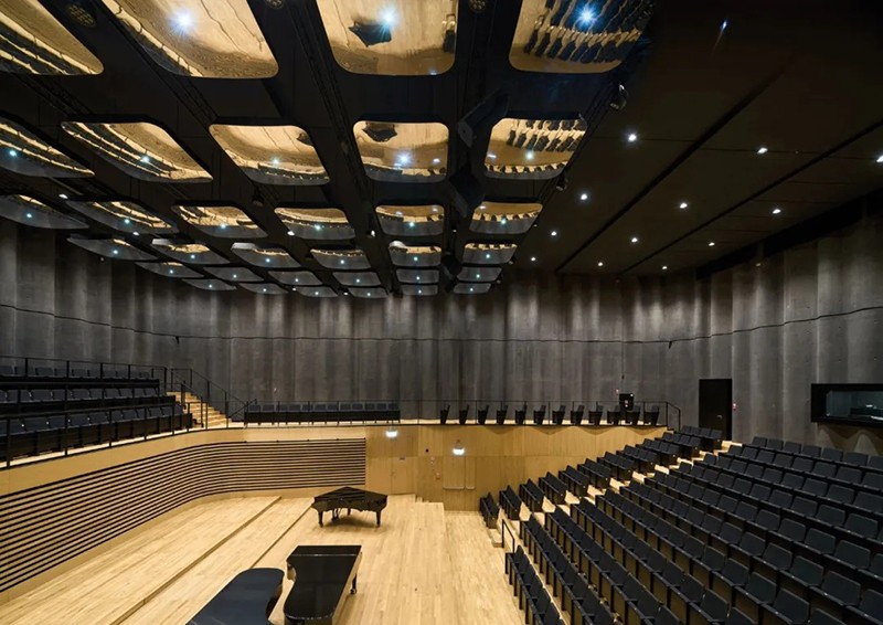 SLAS Architekci 選擇混凝土作為音樂(lè)廳結(jié)構(gòu)、聲學(xué)和美學(xué)屬性的主要材料。通過(guò)讓鋼筋混凝土墻暴露在外,并以釉面漆進(jìn)行裝飾,從而無(wú)需額外的聲學(xué)覆層。音樂(lè)廳內(nèi)部采用聲學(xué)優(yōu)化的波浪圖案,這一設(shè)計(jì)元素也延伸至鋼制外觀上。這不僅增強(qiáng)了聲音的擴(kuò)散,還在建筑的內(nèi)外之間創(chuàng)造了視覺(jué)連續(xù)性。鋼制外觀的反射特性有助于建筑與周?chē)h(huán)境的融合,而其耐久性則確保了建筑能夠抵御破壞和時(shí)間的考驗(yàn)。