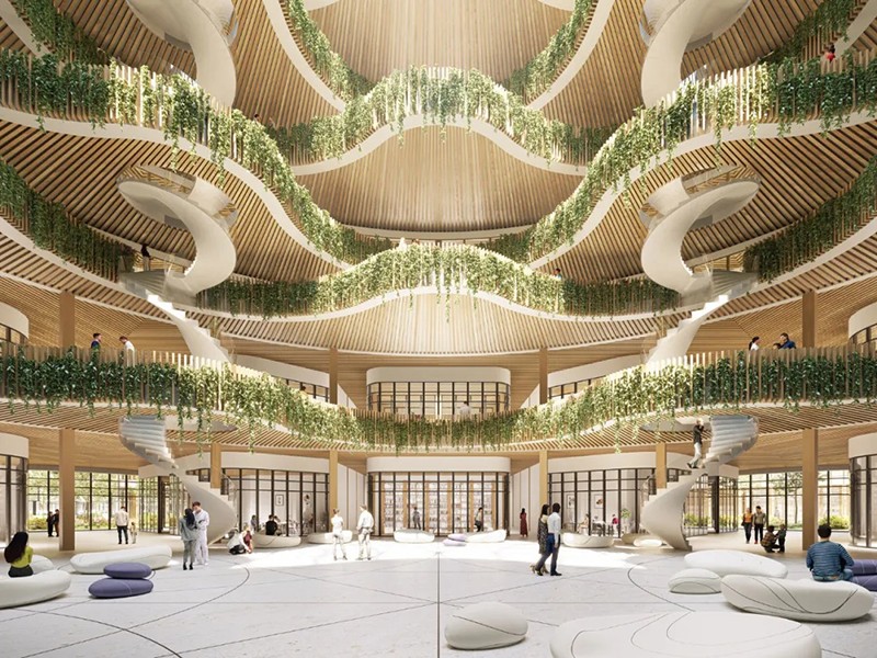 建筑師設(shè)計了一系列結(jié)構(gòu),如 K 號樓、維奇奧橋、垂直森林和醫(yī)療標(biāo)志桿,這標(biāo)志著傳統(tǒng)的醫(yī)院設(shè)計將轉(zhuǎn)向更具綜合性和環(huán)保意識的方法。K 號樓與蒂沃利醫(yī)院的三足鼎立核心相連,目前正在施工中。維奇奧橋就像一座有人居住的橋梁,連接著餐廳、會議室、行政辦公室等各種醫(yī)務(wù)人員設(shè)施以及一個露天劇場。它橫跨馬克斯-布塞特大道,直接連接 K 樓和新龍?zhí)夺t(yī)院,其螺旋形建筑充滿活力,象征著醫(yī)院的合作關(guān)系。垂直森林體現(xiàn)了新龍?zhí)贯t(yī)院的特色,在一座中層建筑中設(shè)有 600 間客房,占地面積 66 500 平方米。其柔和的曲線營造出一種親生物的氛圍,促進(jìn)健康和寧靜。環(huán)形基座圍繞大型天井、中庭和花園設(shè)置了技術(shù)平臺。