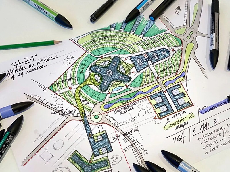 綠色基礎(chǔ)設(shè)施和可持續(xù)解決方案HOSPIWOOD 的目標(biāo)是打造一個真正的生態(tài)社區(qū),讓居民在這里享受生活、工作和就醫(yī)的樂趣。該項目注重資源和流量的高效、平衡管理,在保護(hù)環(huán)境的同時最大限度地利用場地資產(chǎn)。該項目融合了生態(tài)和團(tuán)結(jié)過渡的元素,如城市綠化、可再生能源利用和可持續(xù)交通。總體規(guī)劃采用放射狀同心布局,將人流引向中央中庭,將其作為城市公共樞紐。建筑與景觀和諧地融為一體,融入了風(fēng)力渦輪機(jī)和重新利用的礦渣等特色元素。保護(hù)景觀包括將龍?zhí)兜貕K改造成郁郁蔥蔥的城市森林,以防止土壤人工化。這包括種植當(dāng)?shù)靥赜械臉淠?,促進(jìn)本地生物多樣性,以及實施雨水收集系統(tǒng)。新東部城市大道沿線綠樹成蔭的山谷是一個顯著特點,它是一個雨水過濾池,為居民提供了一個寧靜的環(huán)境。這種綜合方法尊重了該地區(qū)的工業(yè)、文化和自然遺產(chǎn),豐富了社區(qū)的特征。