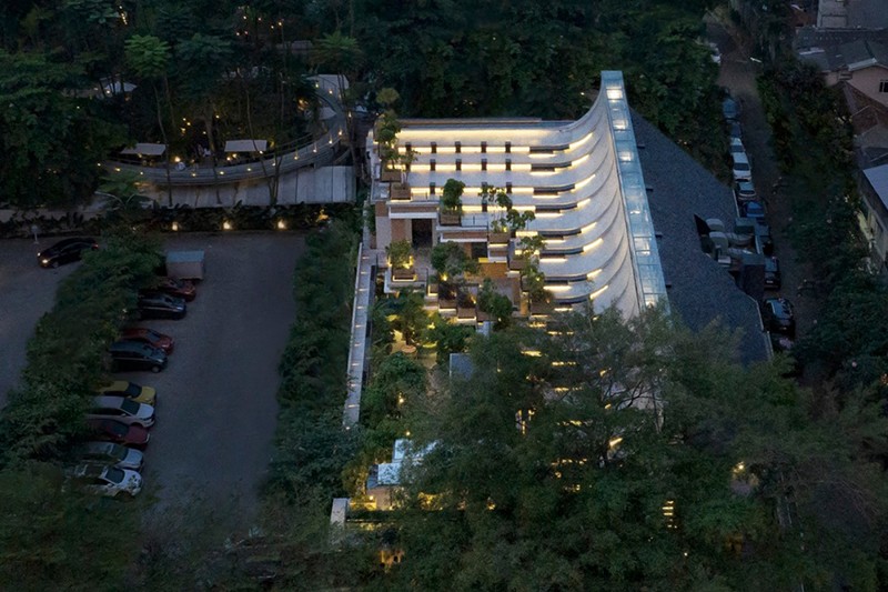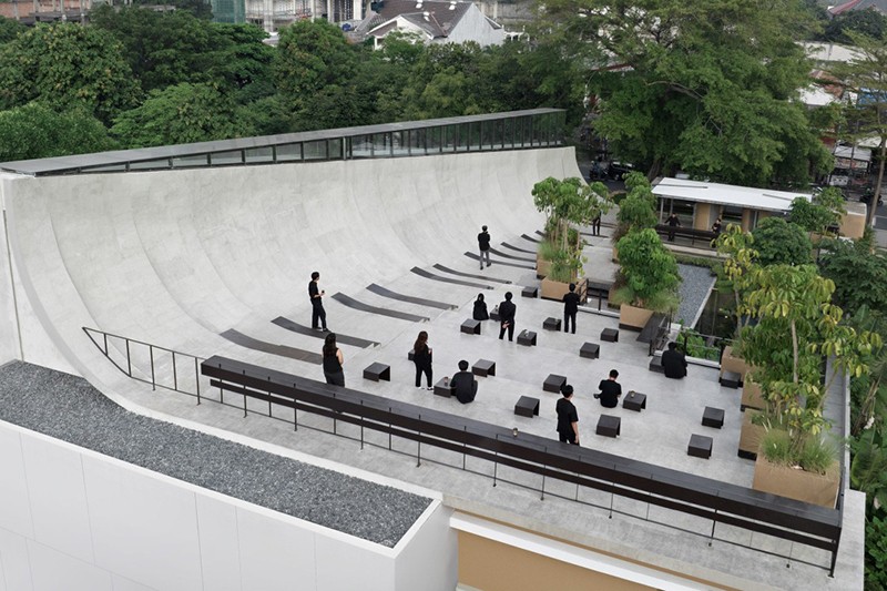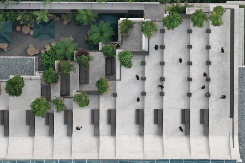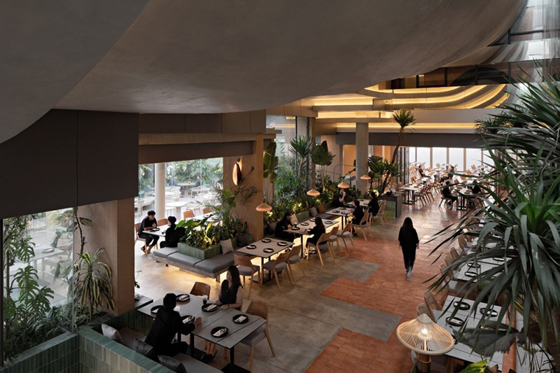 Aruma Split Garden是一個獨特的餐廳項目,占地 2500㎡。其屋頂最為特別,采用了階梯式設計,結(jié)合了屋頂、立面、墻壁、對角懸臂結(jié)構(gòu)和家具等多種元素。