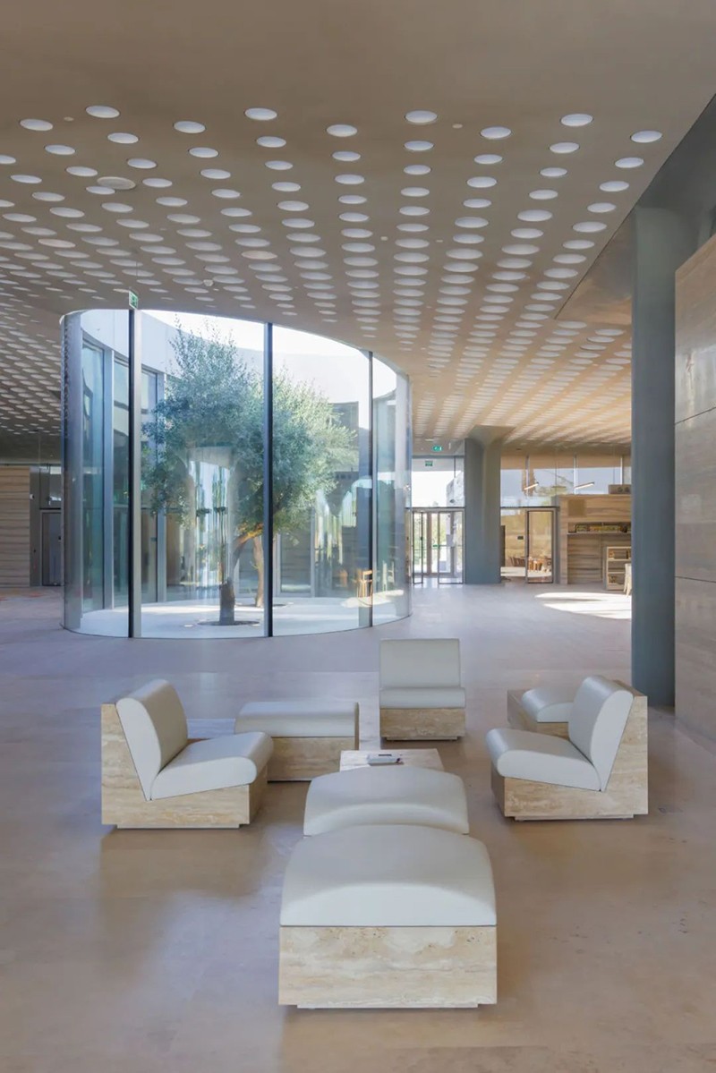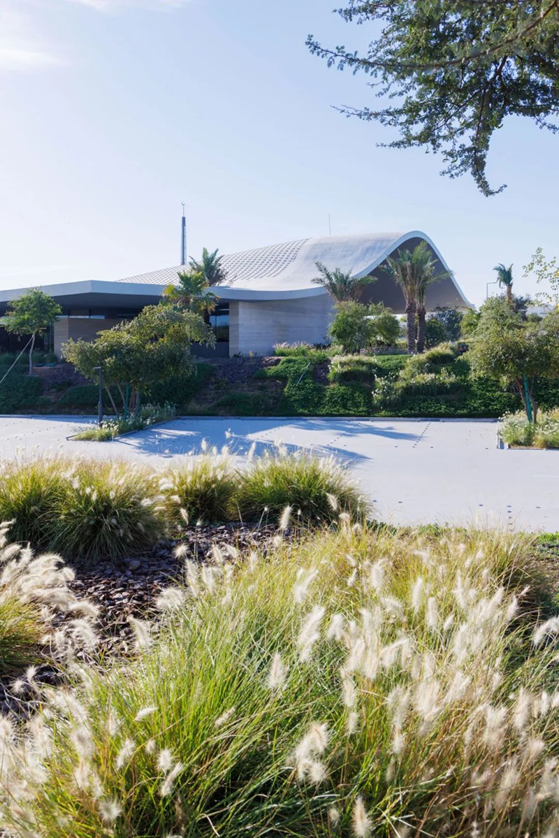 建筑的波浪形屋頂象征女性持續(xù)向上、自我成長的力量。兩棵橄欖樹穿過屋頂結(jié)構(gòu)、向天而立,寓意和平與生命的延續(xù)。室內(nèi)外空間通過庭院與花園過渡連接,強(qiáng)化了人與自然的精神交匯,為來訪者提供安靜冥想與社區(qū)互動的可能。
