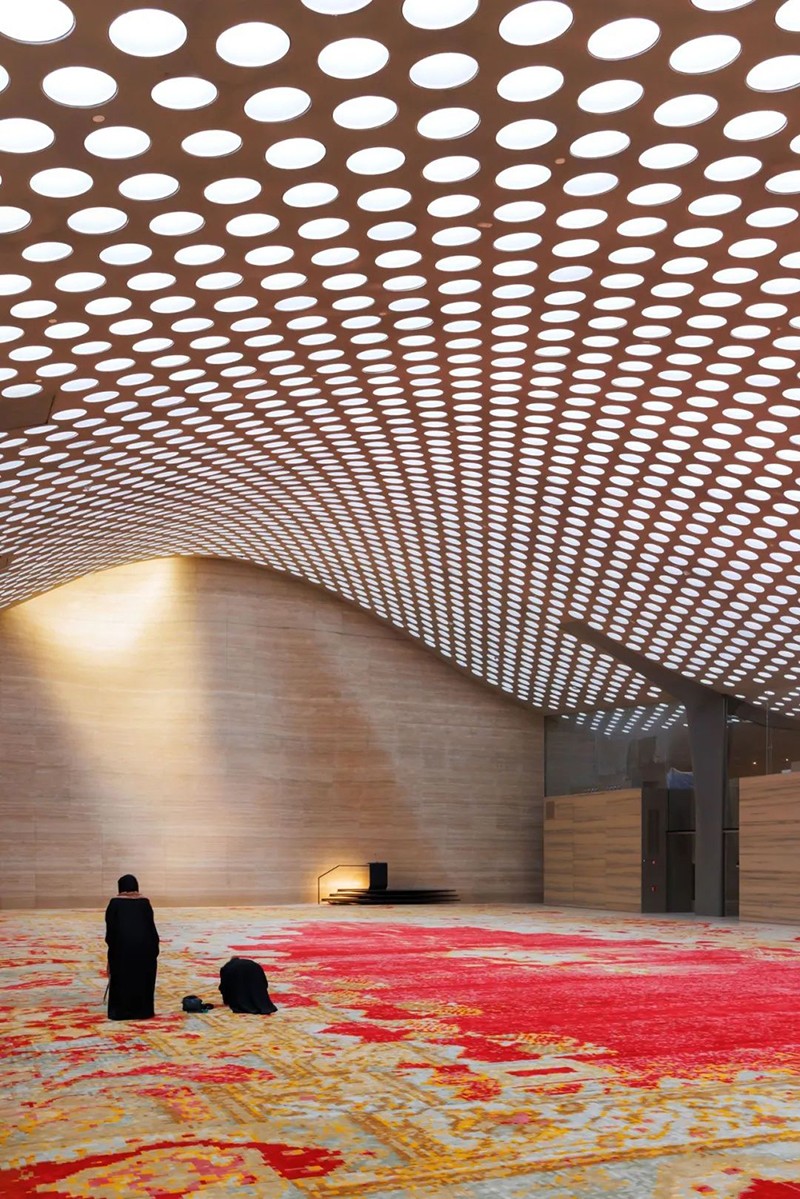 項(xiàng)目的核心為空間是一個(gè)面積875平方米的祈禱大廳,略微偏離建筑網(wǎng)格17度,準(zhǔn)確朝向麥加。廳內(nèi)鋪設(shè)有由新西蘭羊毛制成的大型手工簇絨地毯,其圖案以集體尺度重釋了傳統(tǒng)伊斯蘭幾何紋樣。天花布置了5,500個(gè)錐形天窗,將自然光引入室內(nèi),營造出神圣靜謐的光環(huán)境。
