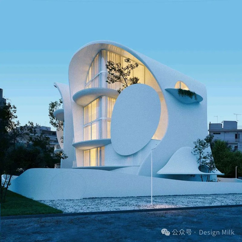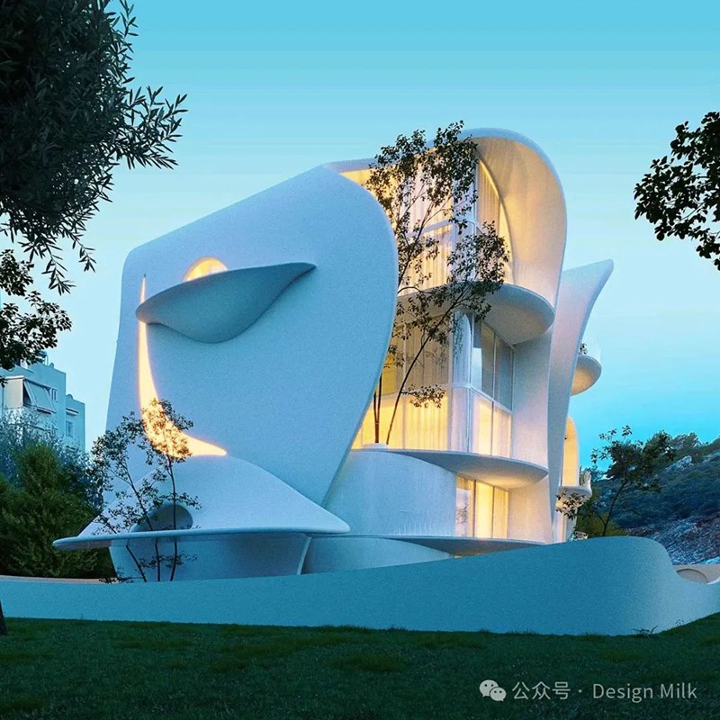 外表面光滑、潔白,加上精心布置的燈光,凸顯了建筑復(fù)雜的輪廓。 設(shè)計中融入了大型圓形開口和彎曲的陽臺,可以看到室內(nèi)景象,并提供與外部無縫融合的室外空間。 這些陽臺上裝飾著綠色植物,不僅增添了一絲自然氣息,也增強(qiáng)了建筑的有機(jī)美感。 整體效果既具有未來感又不失自然,營造出強(qiáng)烈的視覺沖擊。