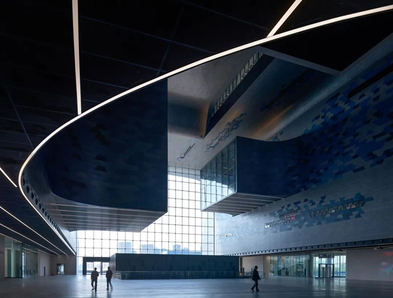 科技館坐落于地鐵光明站旁,其設(shè)計(jì)巧妙地實(shí)現(xiàn)了建筑與自然環(huán)境的有機(jī)融合。西側(cè)建筑體量如流水般延伸至公園綠地,形成層層疊落的景觀露臺(tái),既拓展了展覽空間,又創(chuàng)造了豐富的公共活動(dòng)區(qū)域。中央中庭采用全玻璃幕墻設(shè)計(jì),讓自然光線自由傾瀉而入,懸浮式展廳與嵌入式展區(qū)相互交織,營(yíng)造出極具未來(lái)感的流動(dòng)空間體驗(yàn)。參觀者在探索科技展項(xiàng)的同時(shí),也能透過(guò)通透的玻璃幕墻欣賞室外美景,實(shí)現(xiàn)室內(nèi)外空間的自然過(guò)渡。