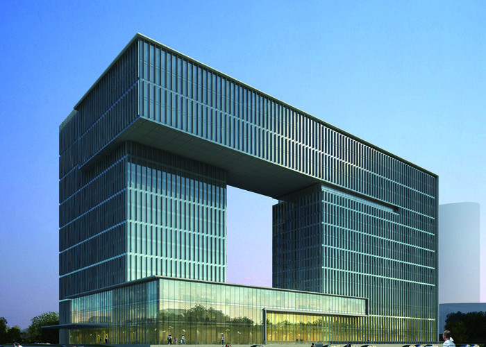 東景五星級酒店及辦公樓項目位于貴陽市觀山湖區(qū),基地東鄰貴陽市行政中心,北鄰鋁鎂設計院,南鄰貴州移動指揮調度中心,西向陽森房產,地塊基本呈矩形,項目總用地面積24966平方米,總建筑面積99284平方米,其中地下建筑面積41915平方米。地上建筑面積共57369平方米,地下部分共計4層,為停車庫及酒店配套用房。地上部分由一棟結構總高64.4m的14層辦公樓和一棟結構總高68.8m的16層酒店組成,兩棟塔樓平面呈L型布置,結構形式均為現(xiàn)澆框架剪力墻結構,辦公樓頂部采用鋼結構向外懸挑兩層,懸挑跨度為11.1m。辦公樓和酒店在頂部通過跨度為30m鋼結構連接體相連,連接體在辦公樓側與混凝土柱鉸接相連,在酒店一側用滑移支座相連,滑移支座接罕遇地震下兩座單體最不利彈性位移進行設計,保證兩個單體在罕遇地震下不致相撞或脫開。